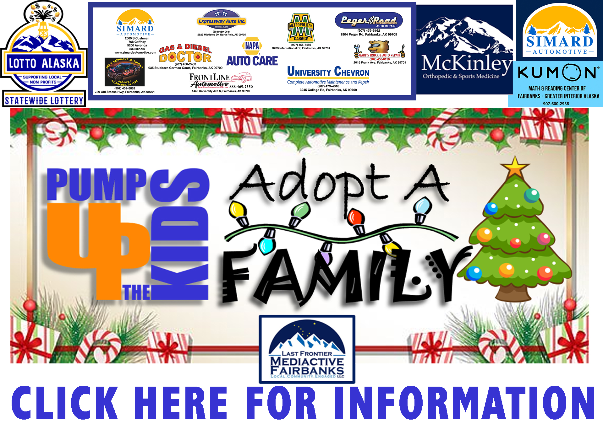 Starting Monday November 10th at 9AM you can participate in the PUMP Up the KIDS: Adopt-A-Family GIFT TAG GRAB! Stop at the Last Frontier Mediactive River 96.9 FM Office at 529 5th Ave Suite 200 Fairbanks and Grab a gift tag to help adopt a family in need. The gift tags will be printed with items from each nominated family.